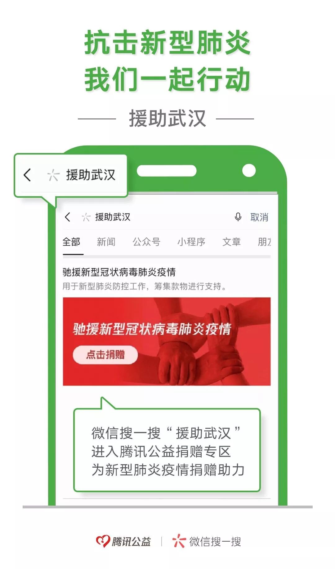 另外,微信支付已经开通绿色通道,优先处理医疗机构、基金会等机构快速开通微信支付各项服务的申请和功能开通,大家也可以通过微信搜一搜“援助武汉”,进入腾讯公益专区进行捐赠。