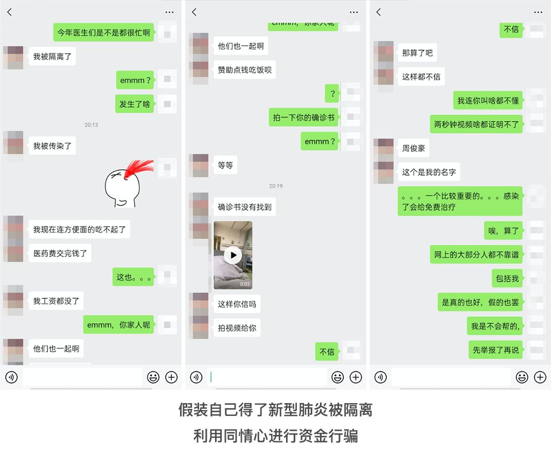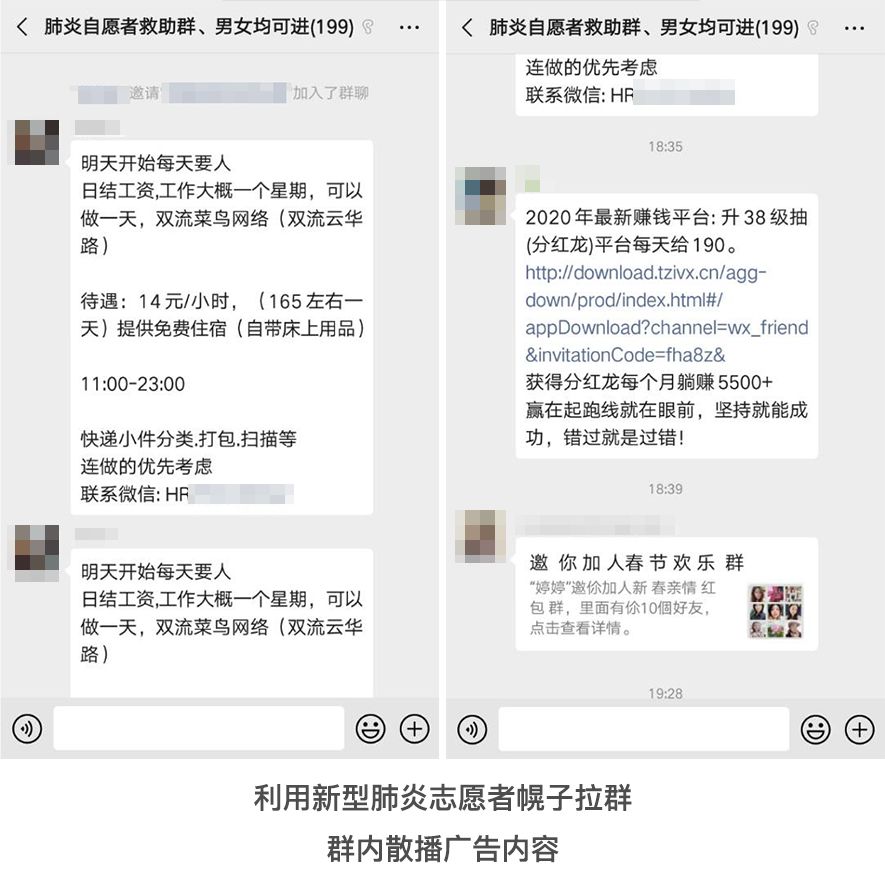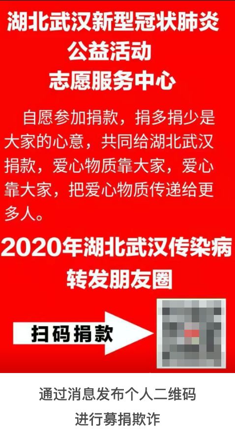 有的不法分子通过微信朋友圈、微信消息发布个人收款二维码,或冒充民间公益募捐组织进行募集资金;有的假装自己得了新型肺炎被隔离,利用同情心进行诈骗;还有的打着新型肺炎志愿者救助的幌子建微信群,实则散布广告内容。