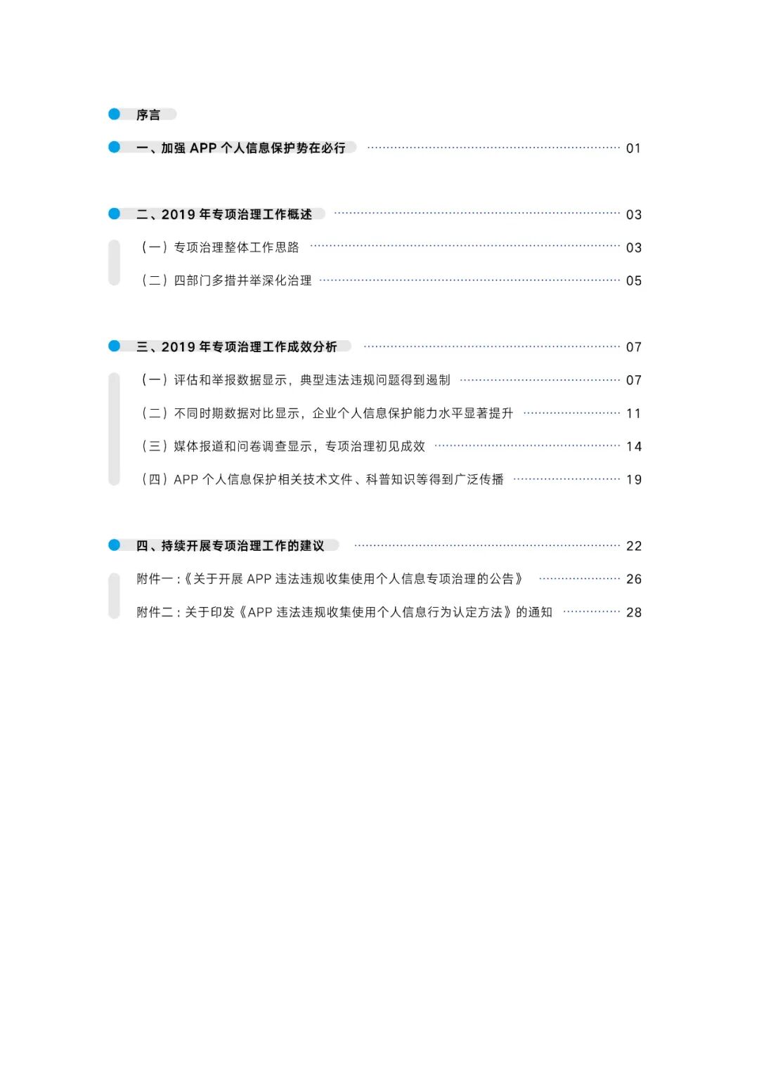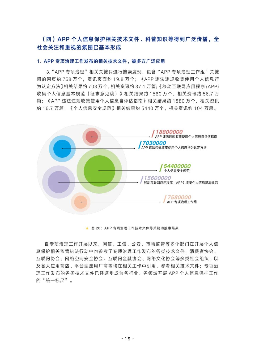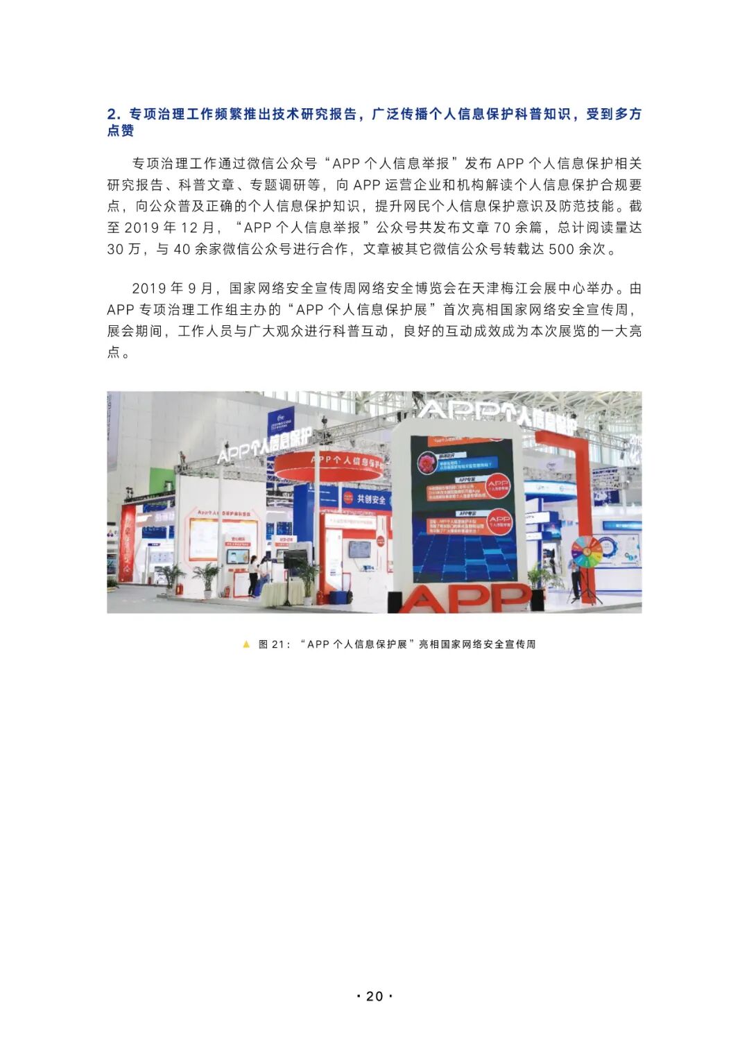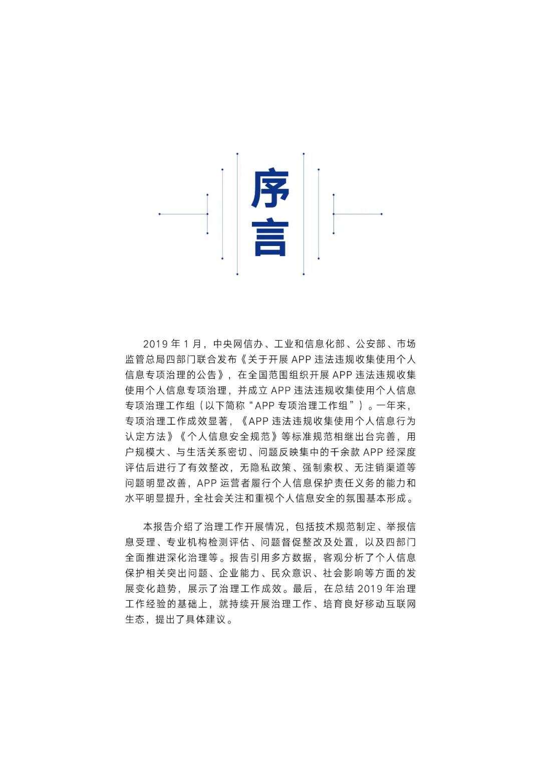 《APP违法违规收集使用个人信息专项治理报告(2019)》介绍了治理工作开展情况,包括技术规范制定、举报信息受理、专业机构检测评估、问题督促整改及处置,以及四部门全面推进深化治理等;报告引用多方数据,客观分析了个人信息保护相关突出问题、企业能力、民众意识、社会影响等方面的发展变化趋势,展示了治理工作成效。最后,在总结2019年治理工作经验的基础上,就持续开展治理工作,培育良好移动互联网生态,提出了具体建议。