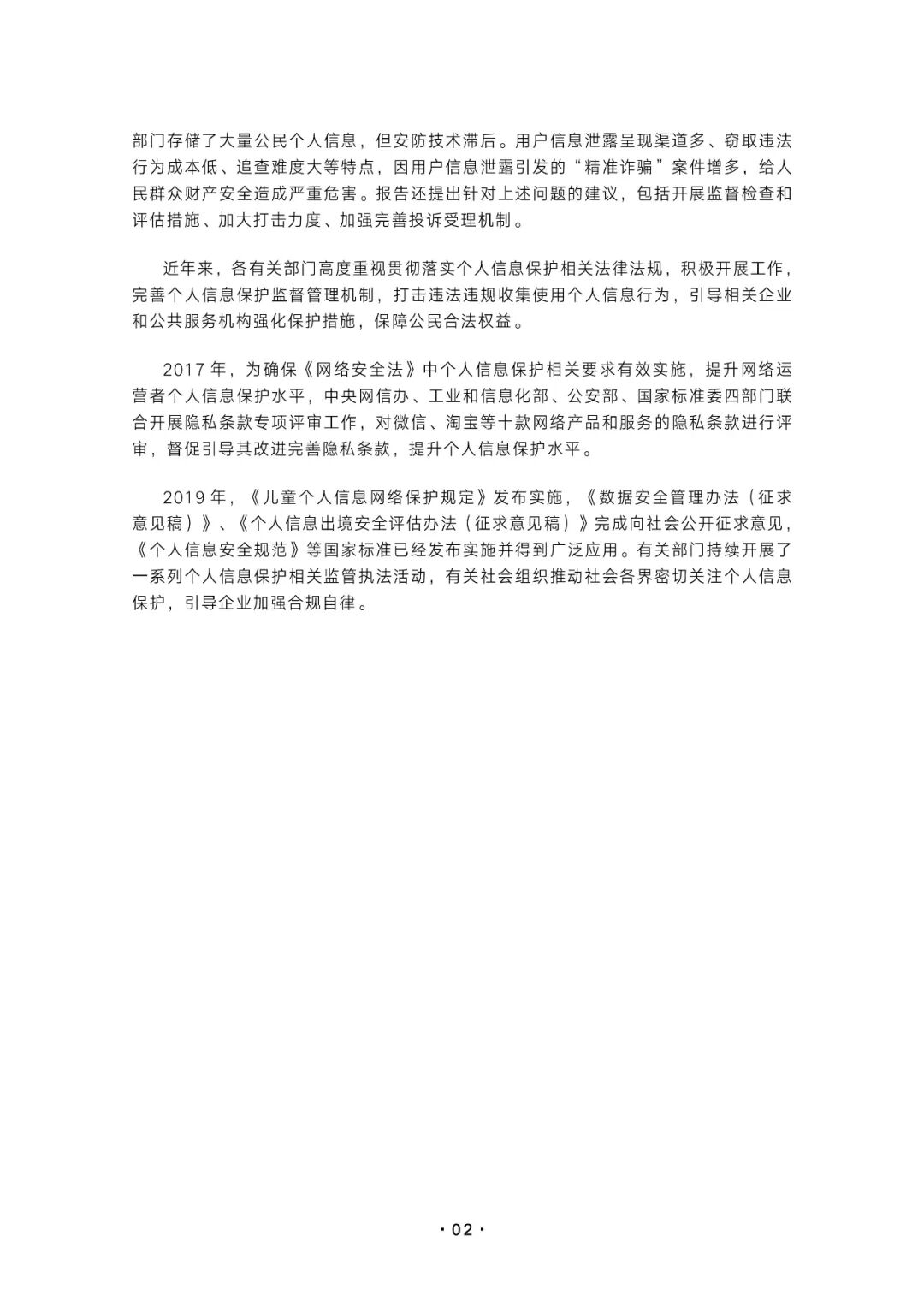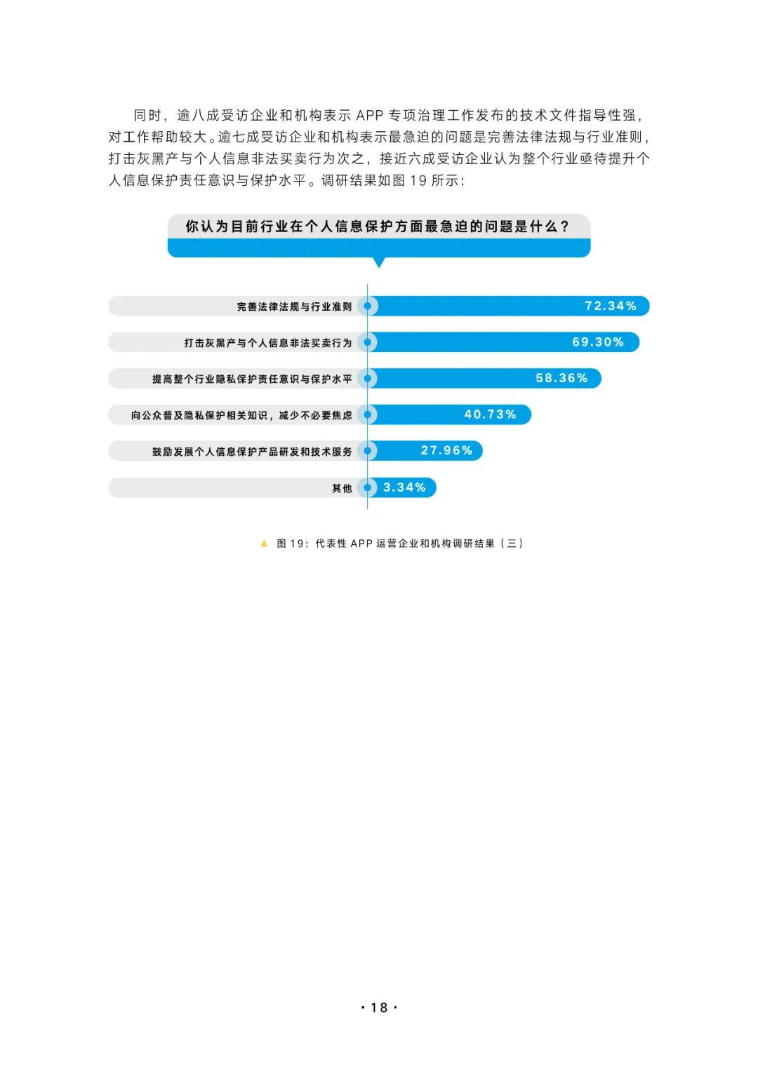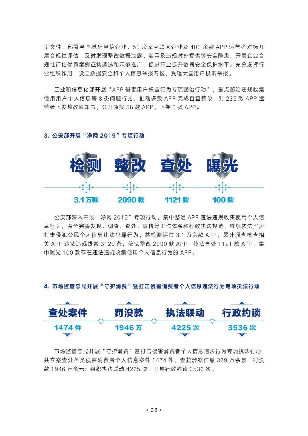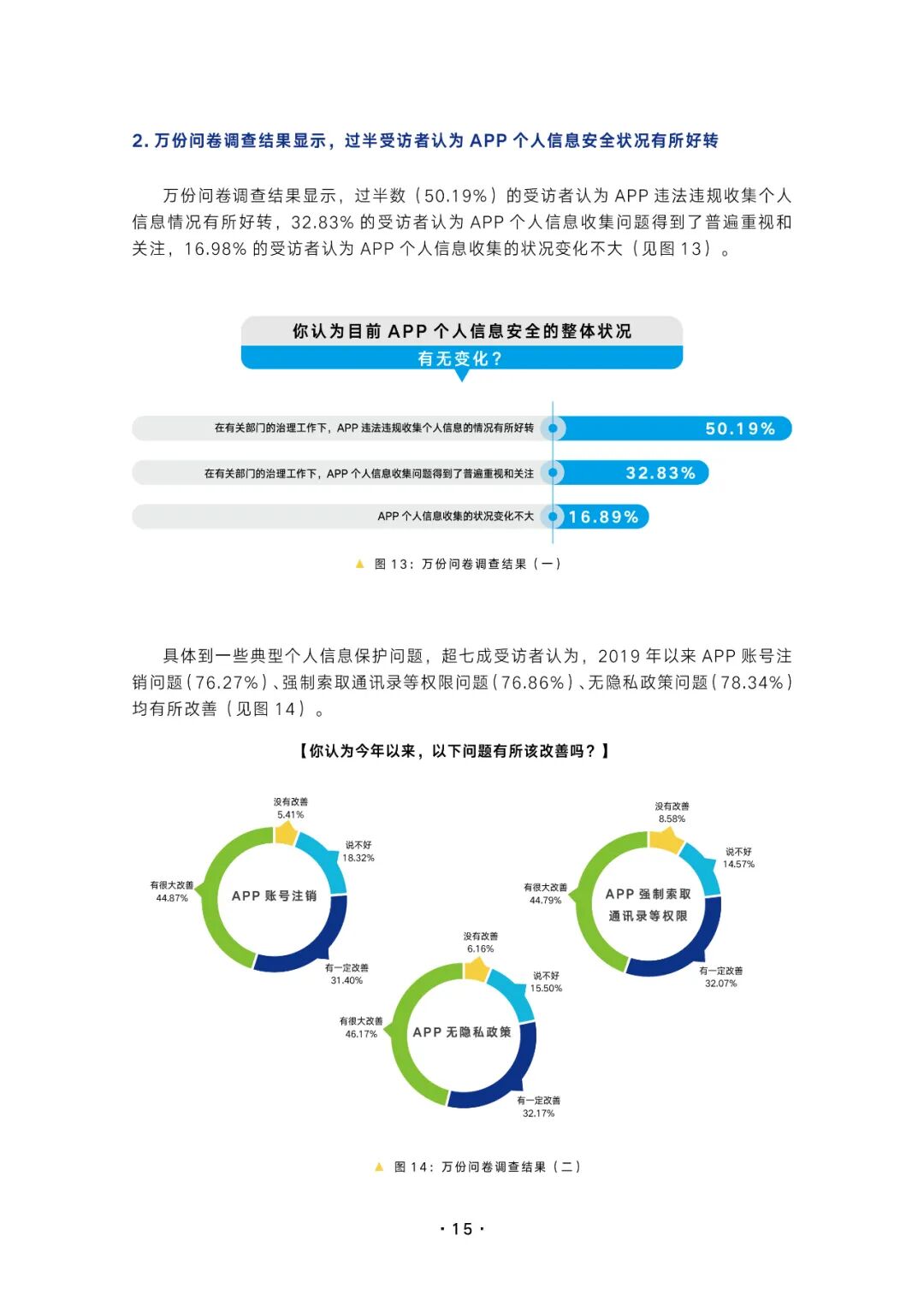 《APP违法违规收集使用个人信息专项治理报告(2019)》介绍了治理工作开展情况,包括技术规范制定、举报信息受理、专业机构检测评估、问题督促整改及处置,以及四部门全面推进深化治理等;报告引用多方数据,客观分析了个人信息保护相关突出问题、企业能力、民众意识、社会影响等方面的发展变化趋势,展示了治理工作成效。最后,在总结2019年治理工作经验的基础上,就持续开展治理工作,培育良好移动互联网生态,提出了具体建议。