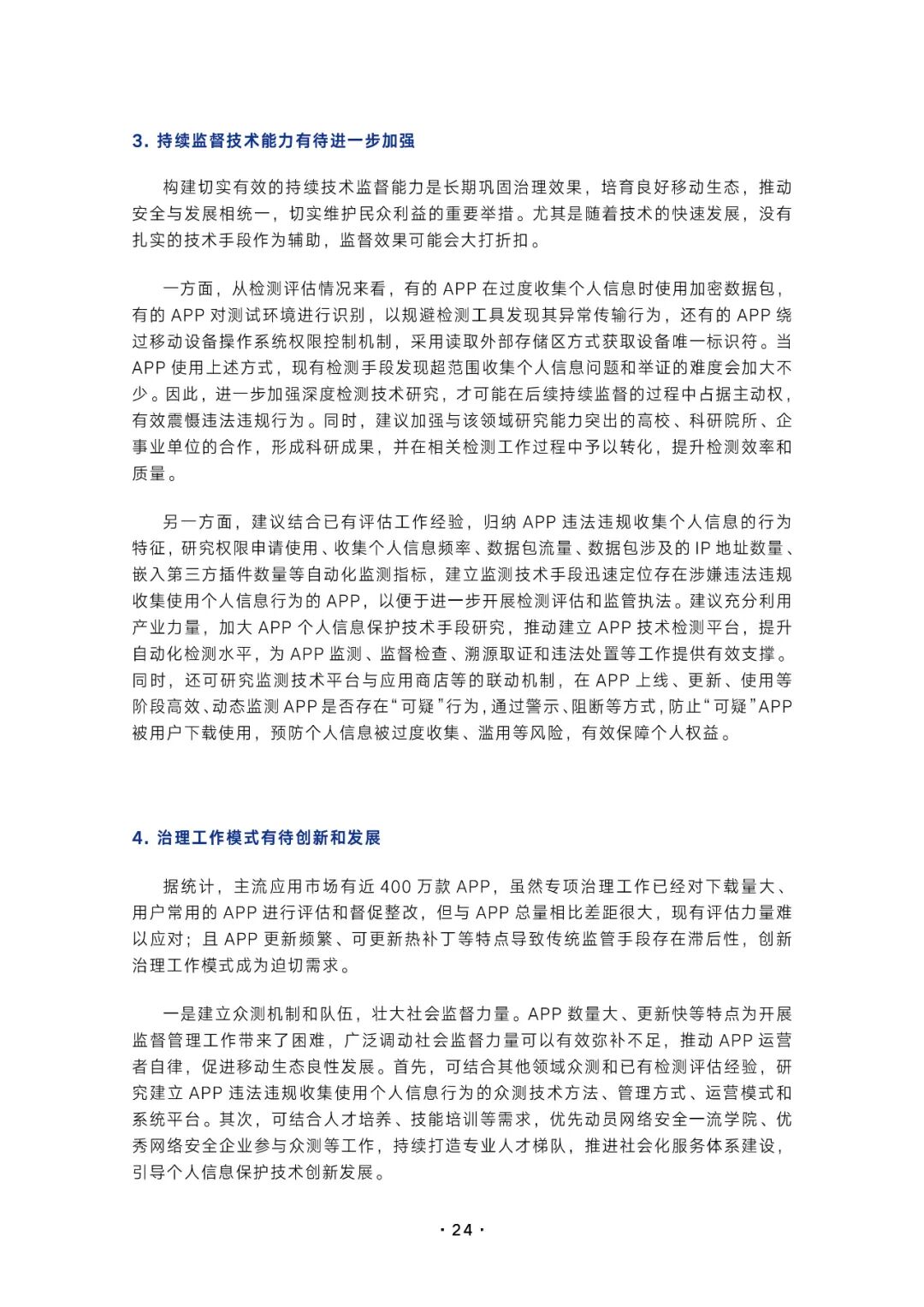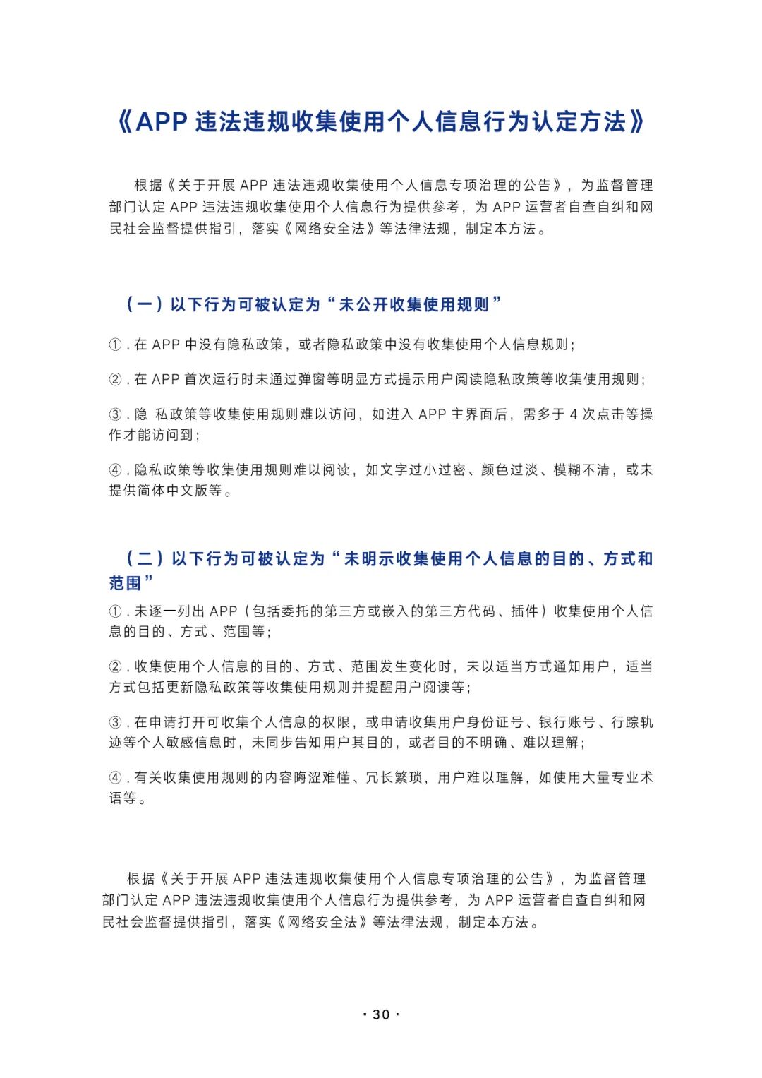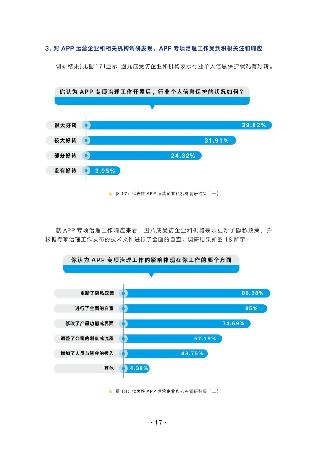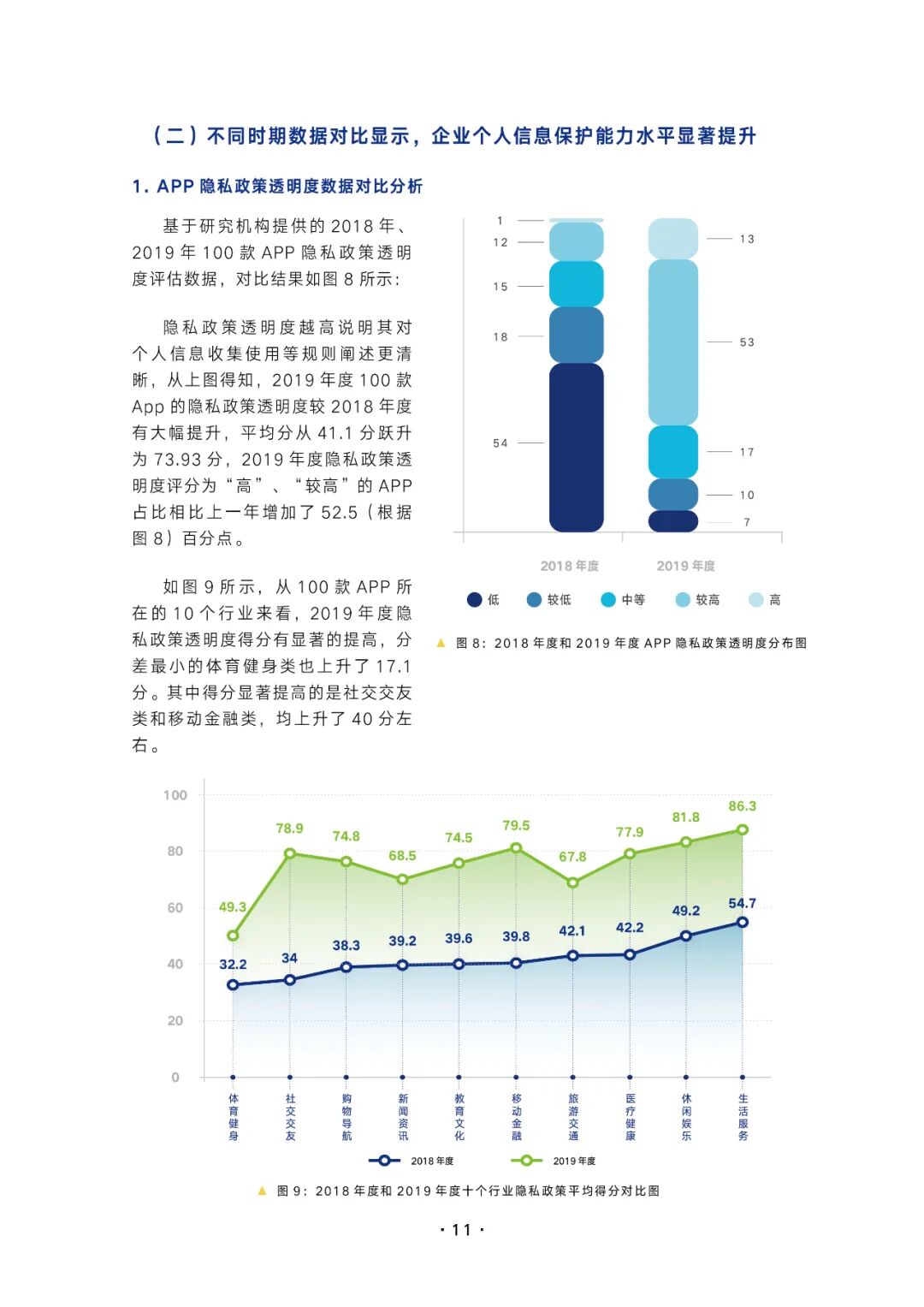 《APP违法违规收集使用个人信息专项治理报告(2019)》介绍了治理工作开展情况,包括技术规范制定、举报信息受理、专业机构检测评估、问题督促整改及处置,以及四部门全面推进深化治理等;报告引用多方数据,客观分析了个人信息保护相关突出问题、企业能力、民众意识、社会影响等方面的发展变化趋势,展示了治理工作成效。最后,在总结2019年治理工作经验的基础上,就持续开展治理工作,培育良好移动互联网生态,提出了具体建议。