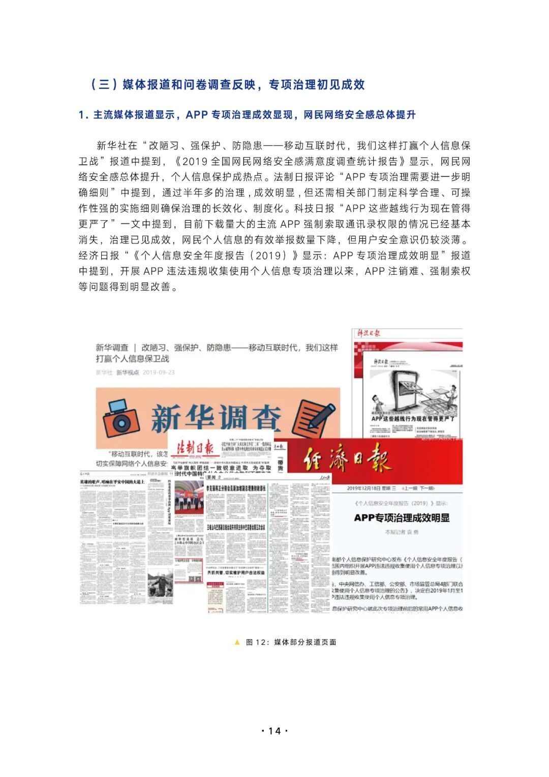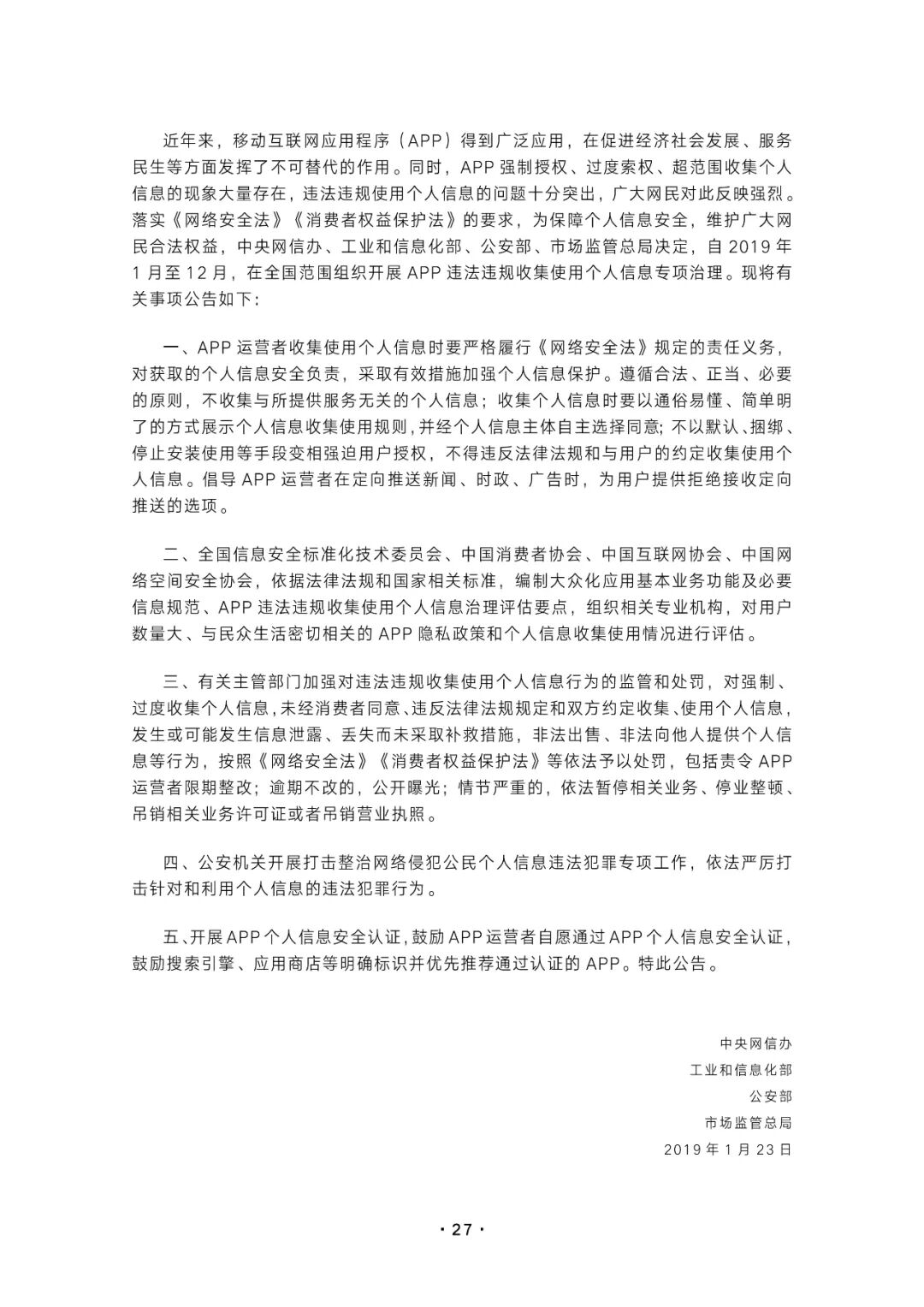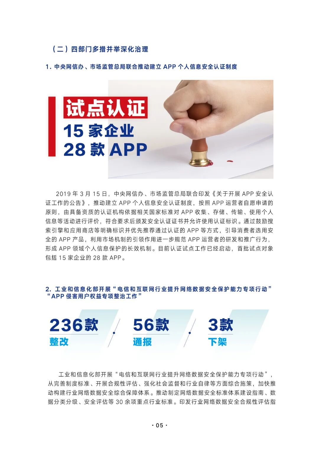 2019年1月,中央网信办、工业和信息化部、公安部、市场监管总局四部门联合发布《关于开展APP违法违规收集使用个人信息专项治理的公告》,在全国范围组织开展APP违法违规收集使用个人信息专项治理,并成立APP违法违规收集使用个人信息专项治理工作组。一年来,专项治理工作成效显著,《APP违法违规收集使用个人信息行为认定方法》《个人信息安全规范》等标准规范相继出台完善,用户规模大、与生活关系密切、问题反映集中的千余款APP经深度评估后进行了有效整改,无隐私政策、强制索权、无注销渠道等问题明显改善,APP运营者履行个人信息保护责任义务的能力和水平明显提升,全社会关注和重视个人信息安全的氛围基本形成。