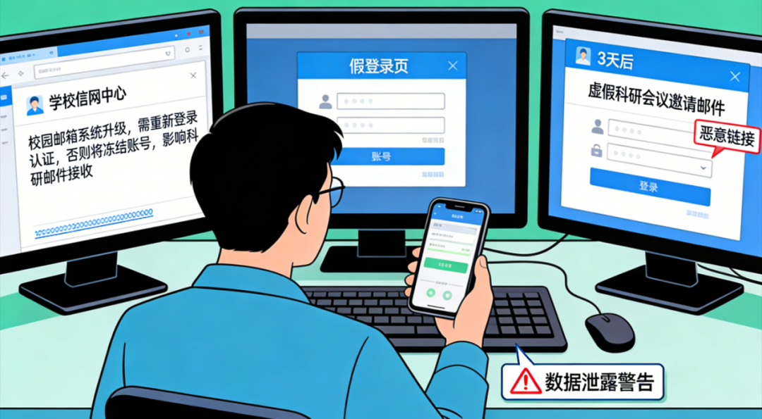 某高校科研老师收到“学校信网中心”的邮件,声称“校园邮箱系统升级,需重新登录认证,否则将冻结账号,影响科研邮件接收”。邮件内含短链接,点击后跳转至与学校统一认证平台完全一致的登录页,老师输入账号、密码,并完成短信验证后,未发现异常。3天后,该老师发现自己的邮箱向全校师生群发了虚假科研会议邀请邮件,附带恶意链接,同时电脑内的科研项目数据被泄露。