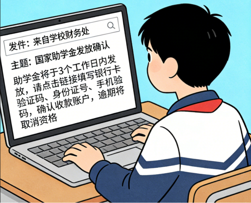 某高校学生收到一封“来自学校财务处”的邮件,主题为“国家助学金发放确认”。邮件正文称“助学金将于3个工作日内发放,请点击链接填写银行卡号、身份证号、手机验证码,确认收款账户,逾期将取消资格”。该学生急于领取助学金,未核对发件人邮箱细节,直接点击链接填写信息,导致卡内生活费被盗刷。