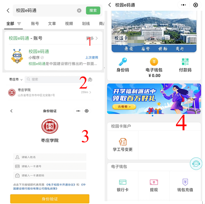 微信公众号搜索“枣庄学院网络中心”,点击下方菜单栏“一码通”,选择“校园一码通”进入绑定界面 ;支付宝搜索“枣庄学院一卡通”。点击“绑定一卡通信息”,输入姓名,学工号,校园卡查询密码(默认身份证后6位数字,身份证后6位带字母X的,密码是字母X前面的6位数字)绑定微信/支付宝电子校园卡。